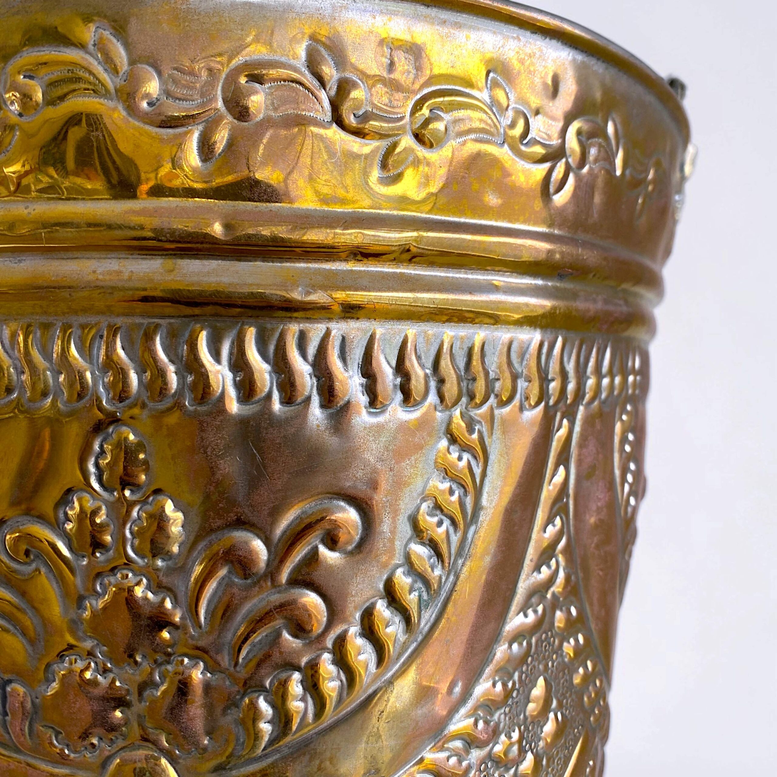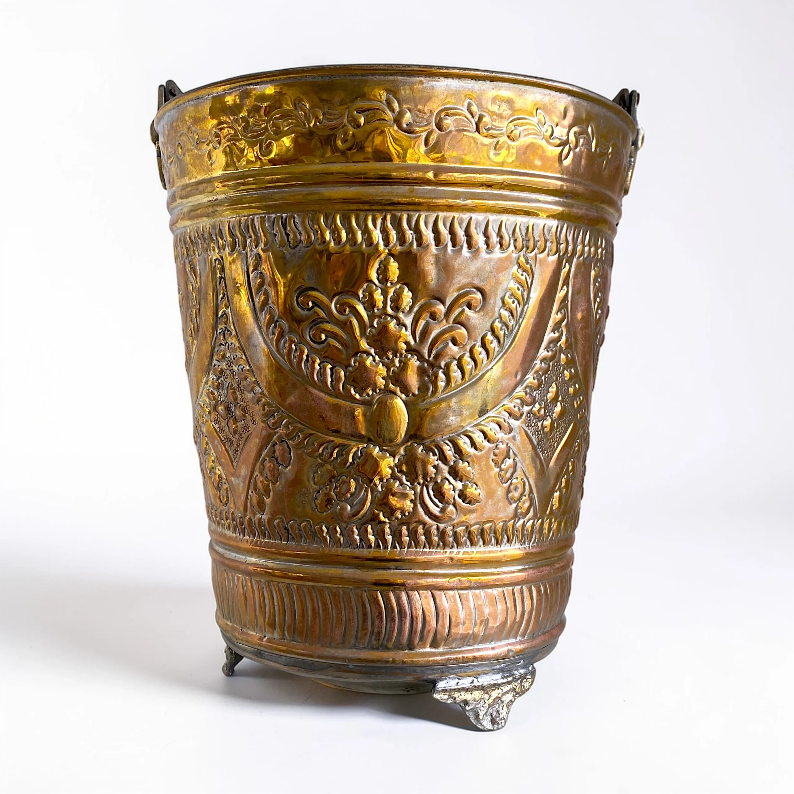 Smuk og dekorativ hammamspand i præget messing med fine orientalske detaljer og praktisk håndtag. Spanden har en varm gylden patina og står på små fødder. Perfekt som vinkøler, dekorativ opbevaring, plantekrukke eller som unikt indslag i badeværelse eller stue.