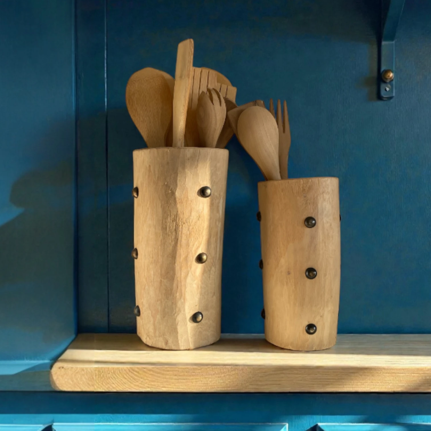 Kontrasten mellem det varme træ og de mørke metalsøm skaber et tidløst design, der passer smukt ind i både nordisk, rustik og boheme-inspireret indretning. Hver beholder er et unika, hvor små variationer i træets struktur og sømmenes placering understreger det ægte håndværk.
