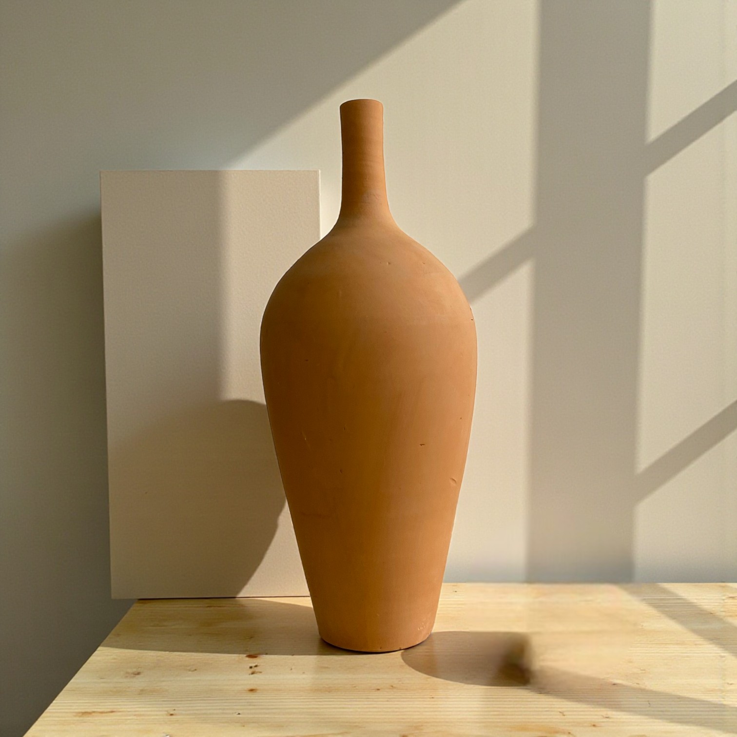 Tilføj et strejf af marokkansk charme til din bolig med denne håndlavede keramikkande i naturligt ler. Kanden er drejet i hånden af dygtige marokkanske håndværkere og brændt på traditionel vis, hvilket giver hver enkelt kande et unikt og autentisk udtryk. Den varme terrakottafarve og de små, naturlige ujævnheder vidner om ægte håndværk og gør hver kande helt sin egen.