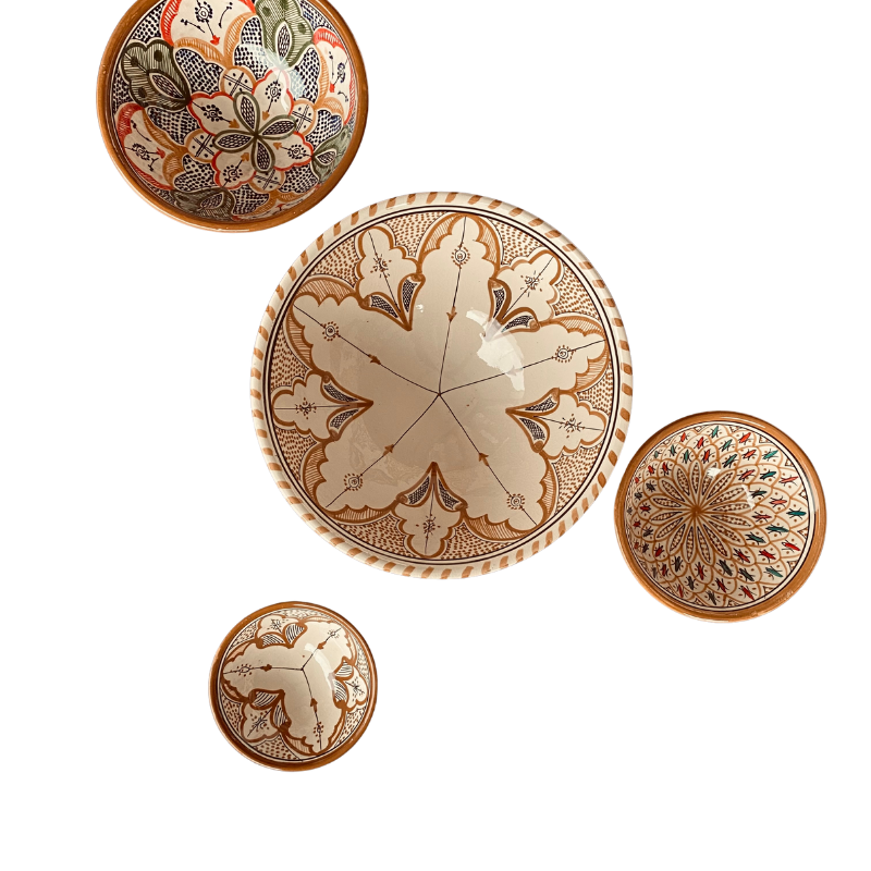 Håndværkerne der laver disse skåle har hvert deres traditionelle design fra de egne de kommer fra i Marokko.